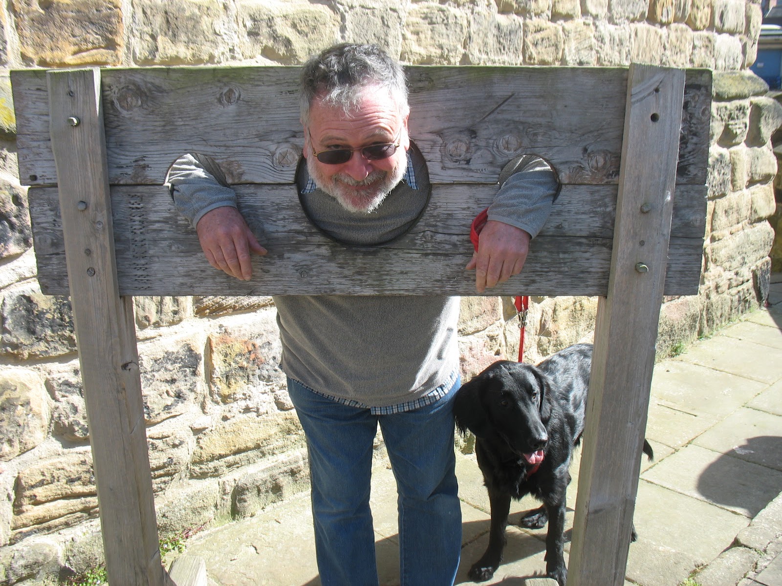 Lastly, we went to a town called Hexham where there was a beautiful abbey. It was huge, with tall stained glass windows and stone artifacts on display that had been unearthed near the church. We even got to visit a crypt beneath the main room where pilgrims and monks used to come and pray. Outside the abbey, we strolled around the charming town, stopping by the old gaol. Here is a picture of Graeme in the stocks, Jack standing by him faithfully.